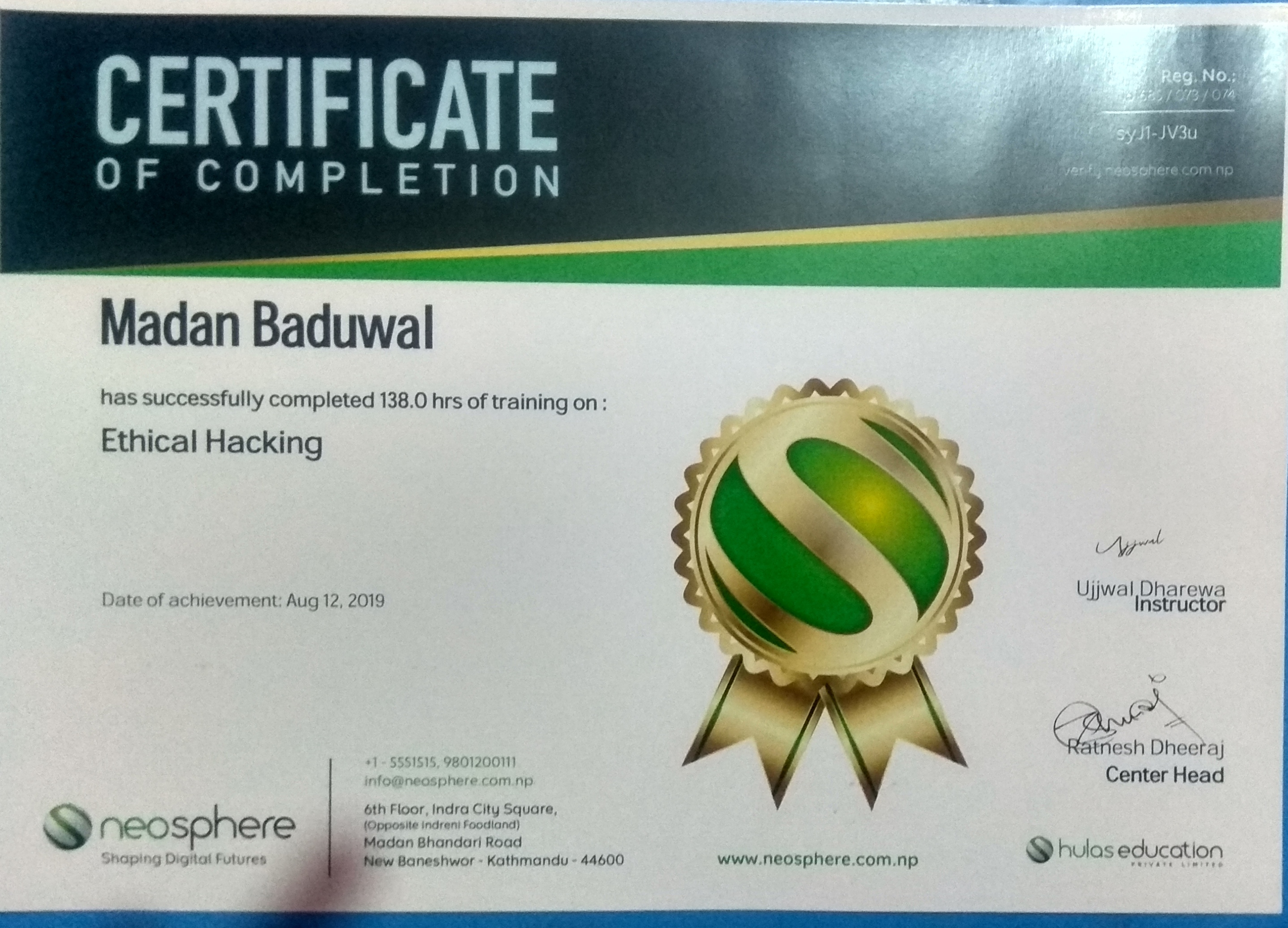 Best idea winner of the Exhibition organized by Kantipur engineering college and sponsored by Neosphere. Neosphere offered 6 month Ethical Hacking course, which was nearly worth $ 200